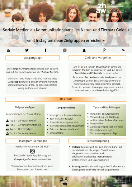 Eine Kampagne ist ein wirkungsvolles Vorhaben um Zielgruppen langfristig für sich zu gewinnen. Um eine gelungene Kampagne über Soziale Medien zu führen, bedarf es einer gut durchdachten Strategie, einer detaillierten Planung sowie zielgruppenspezifische Inhalte. Aufgrund dessen ist für den Natur- und Tierpark Goldau eine Kampagnenskizze über Instagram ausgearbeitet worden, welche den Einstieg in die Kommunikation und Interaktion über soziale Netzwerke erleichtern und verbessern soll.