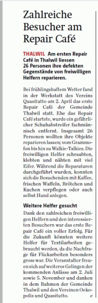 Die Idee meiner Semesterarbeit auf kommunaler Ebene partizipative Prozesse zu fördern, stiess in Thalwil auf offene Ohren. Der Wunsch ein Repair Café zu gründen war schon lange vorhanden, jedoch nicht die nötigen personellen Ressourcen. Ich brachte die verschiedenen Akteure zusammen und konnte aufzeigen, dass die Basis für ein Repair Café vorhanden ist.